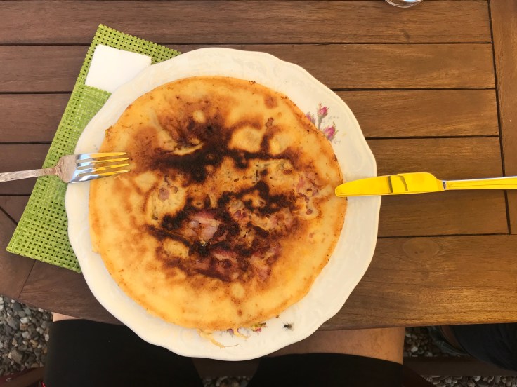 Wir wurden sehr freundlich empfangen und da ich im Vorfeld reserviert hatte, eigentlich schon erwartet. Nach der kurzen Einweisung und der Brötchenbestellung folgte das Aufbauen der Behausung und der Bezug der Selbigen. Junior hatte Spaß, also alles richtig gemacht. Es stand uns zwar ein „Aufenthaltsraum“ mit Kochmöglichkeit zur Verfügung, aber wir zogen die Sitzgruppe und den Trangia Spirituskocher im Freien vor. So wie richtige Naturburschen halt. Auf Wunsch des jüngsten Mitgliedes der Reisegruppe gab es Ravioli. Die gehen irgendwie immer und sind ja auf Radreisen allgemein sehr beliebt. Die beiden Damen aus den Niederlanden mit denen wir zunächst die Zeltwiese teilten, hatten ebenfalls Ravioli zubereitet.
