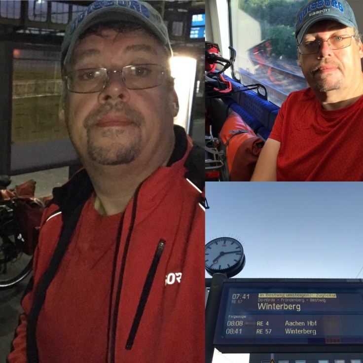 „Wie komme ich nach Winterberg ?“ – Diese Frage war schnell beantwortet: mit dem Zug. Ab Duisburg Hauptbahnhof bis Dortmund und dort umsteigen in den Zug nach Winterberg. 36 Euro für Fahrrad und mich sind ein moderater Preis. Das „SchönerTagTicket für Singles“ kann Samstags und Sonntags ab Mitternacht ganztägig genutzt werden (in der Woche erst ab 9 Uhr). Eine passende Zugverbindung war schnell gefunden, aber die erste Meile vom Wohndomizil zum Hauptbahnhof ging nicht per S-Bahn, da diese in den gesamten Sommerferien durch SchienenErsatzVerkehr (SEV) per Bus ersetzt wurde. Leider keine Fahrradmitnahme. Also um kurz vor vier Uhr aus dem Bett gequält, geduscht und letzte Sachen zusammengerafft. Nach dem Radel-Check dann los. So fing der Tag um fünf Uhr schon mit den ersten 10 km radeln an und die unter Druck, da ich mal wieder nur schleppend in die Gänge gekommen bin. Na ja – es kam wie es kommen musste, wegen einer baustellenbedingten Umleitung und dem daraus resultierenden Umweg sah ich meinen Zug noch wegfahren. Aber es hat ja alles einen tieferen Sinn (auch wenn man den nicht immer auf Anhieb erkennt). So konnte ich mit an einem der Verkaufsstellen in der Bahnhofshalle einen Kaffee – bekanntlich die wichtigste Mahlzeit am Tag – und ein Käse-Speck-Brezel einverleiben. Oben auf dem richtigen Bahnsteig angekommen, sah ich, dass es eine Alternative für das Teilstück nach Dortmund gibt.