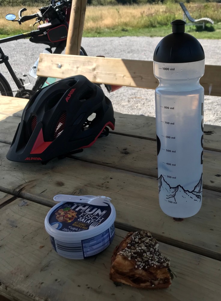 Gegen 12 Uhr habe ich in den Ruhrauen bei Bestwig einen schönen Rastplatz direkt an der plätschernden Ruhr gefunden, der für eine Vesperpause ideal ist. Mehrere teils überdachte Sitzgelegenheiten mit Blick auf das Wasser – genial. Thunfischsalat und Brötchen hatte ich dabei und ließ es mir hier schmecken.