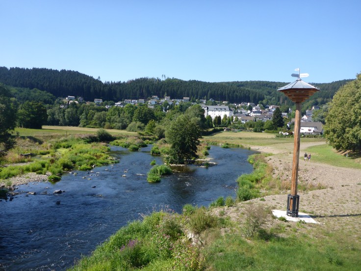 Meine Wasserflaschen konnte ich in Olsberg, dem ältesten Kneippkurort Nordrhein-Westfalens, an einem Kneippbecken für die Arme endlich befüllen. Es steht zwar nicht dran, dass es Trinkwasser ist, aber uch nicht das Gegenteil. Geschadet hat’s nicht, dafür erfrischt. Das war auch bitter nötig, denn die Temperaturen stiegen rasant an. Die 30°C Marke rückte immer näher, was aber noch angenehm war.