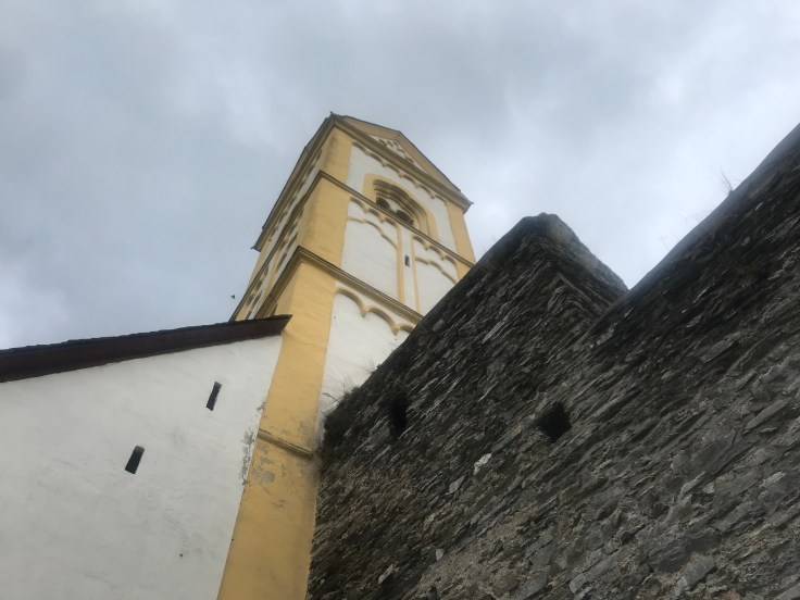 Zum Kloster Arnstein ging es megaknackig den Berg hinauf. Da mich ein DHL Paketfahrer fast vom Rad geholt hat, wurde dieses eine weitere Wandereinlage. Abgekämpft erwartete mich Fred auf dem Parkplatz des Klosters. Während ich noch dabei war, Herz und Lunge wieder in den Körper zu bekommen, filmte Fred schon die schöne Aussicht. Wir besichtigen die Klosterkirche und trafen im Klosterladen auf eine junge Novizin des griechisch-orthodoxen Klosters, die uns mit Begeisterung vom Klosterleben und Ihrer Berufung berichtete.