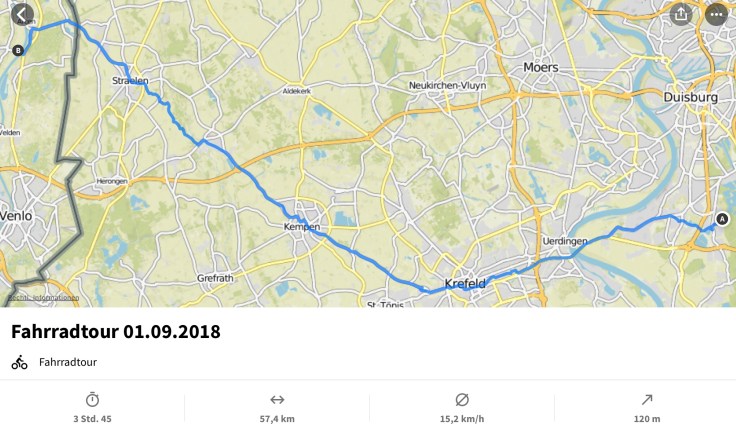 Heim ging es dann entlang der Maas bis Venlo und weiter über die Hinsbecker Schweiz, den Krickebecker Seen nach Kempen. Noch fix durch Krefeld und nach Hause.